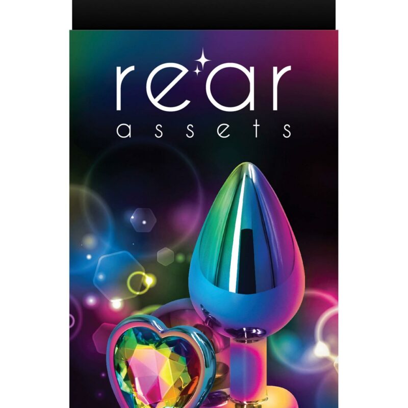 Vidutinio dydžio analinis kištukas su daugiaspalve širdelės formos akute – malonumui ir dekoratyviam, žaismingam vaizdui.