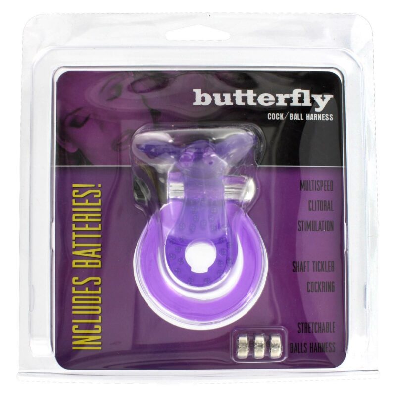 Violetinis dvigubas penio ir sėklidžių žiedas su drugelio formos stimuliatoriumi – poroms, kurios nori daugiau intensyvumo.