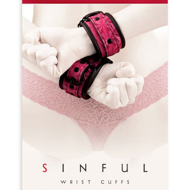 Juodi Sinful rankų antrankiai – minkšti, bet tvirti, skirti rankų suvaržymui ir intensyvesniems BDSM žaidimams.
