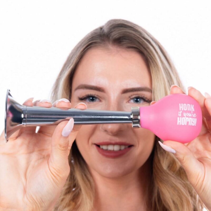 Metalinė sirena su rožiniu gumuotu garsu – smagi žinutė „Honk if you are horny“.