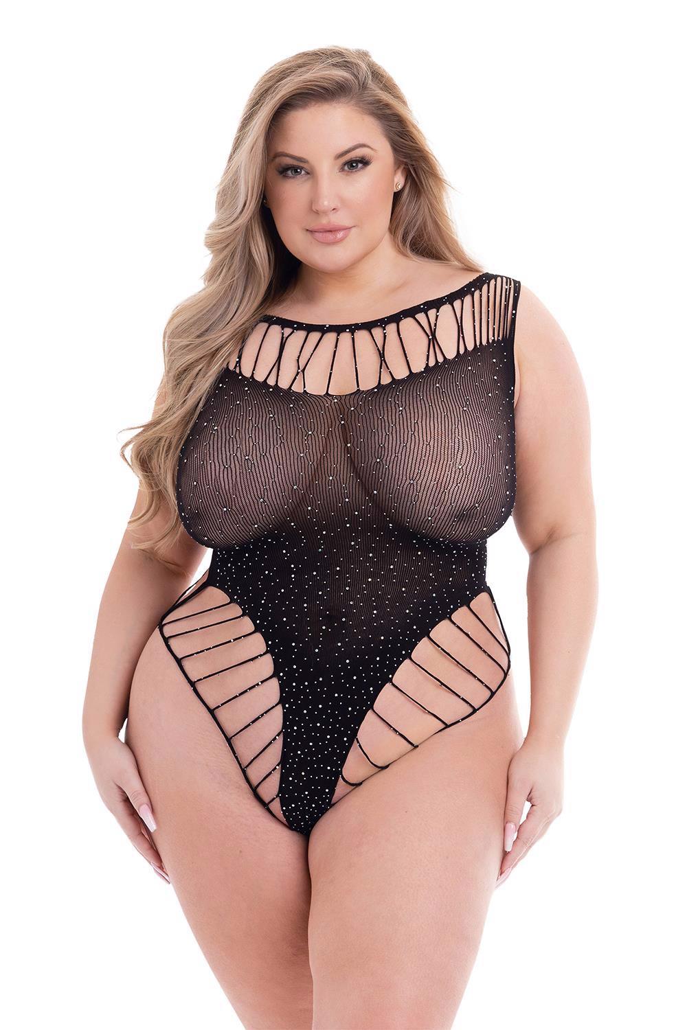 Baci Diamonte Bodysuit Black – juodas gundantis glaustinukas (bodis) (plius dydis)