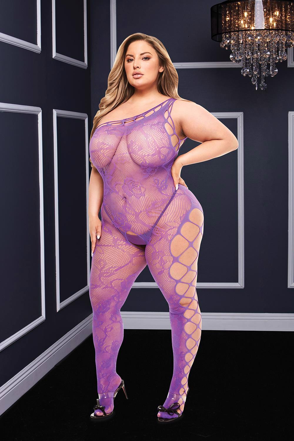 Baci Off The Shoulder Bodystocking Purple – purpurinis erotiškas bodistokingas (kūno kojinė) (plius dydis)