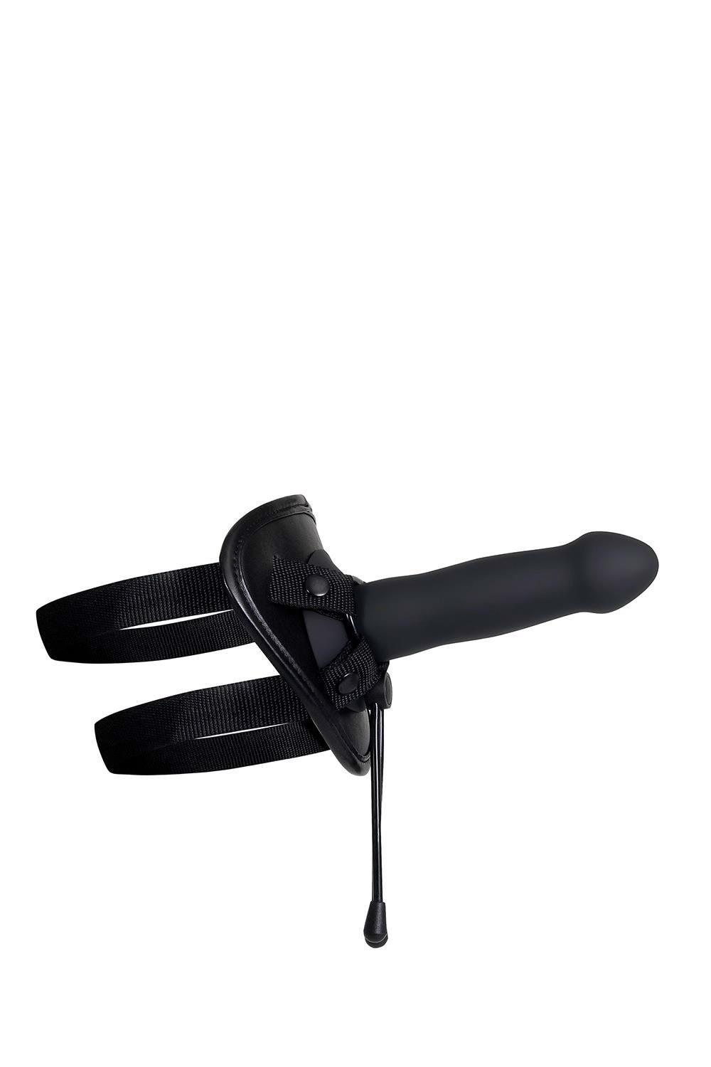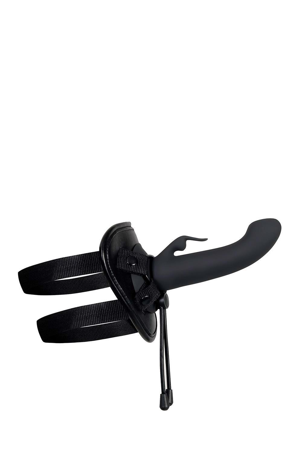Išlaisvinkite fantazijas. Universalus diržų komplektas su galingu vibratoriumi ir dvejomis movomis.