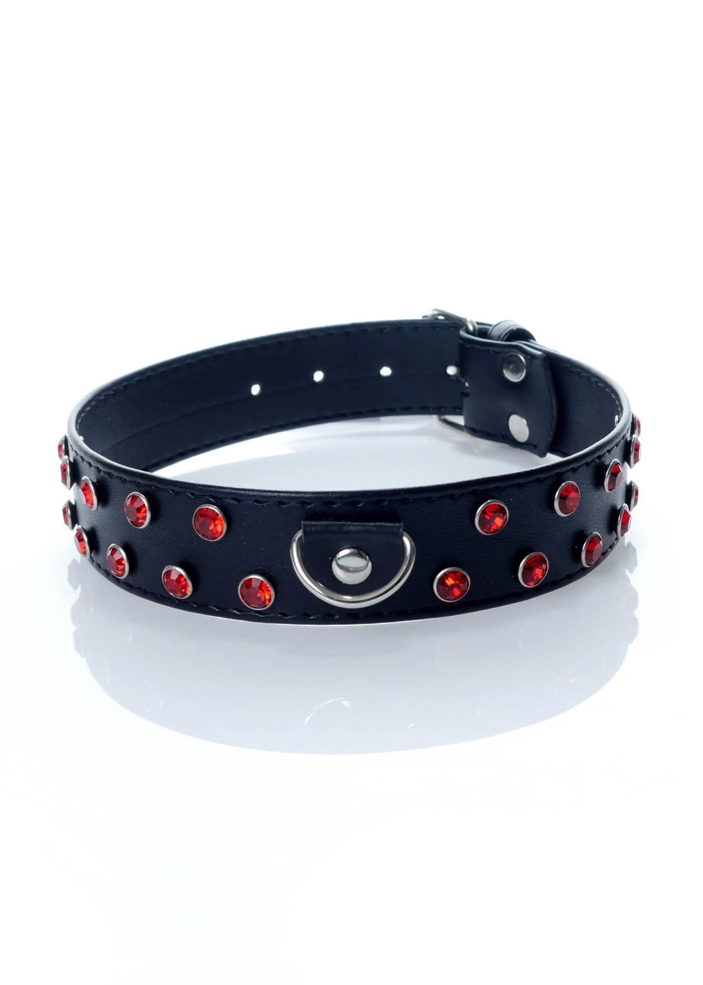 Odinis antkaklis „Fetish B-Series“ – dekoruotas raudonais kristalais, 3 cm pločio, su žiedu pavadėliui.