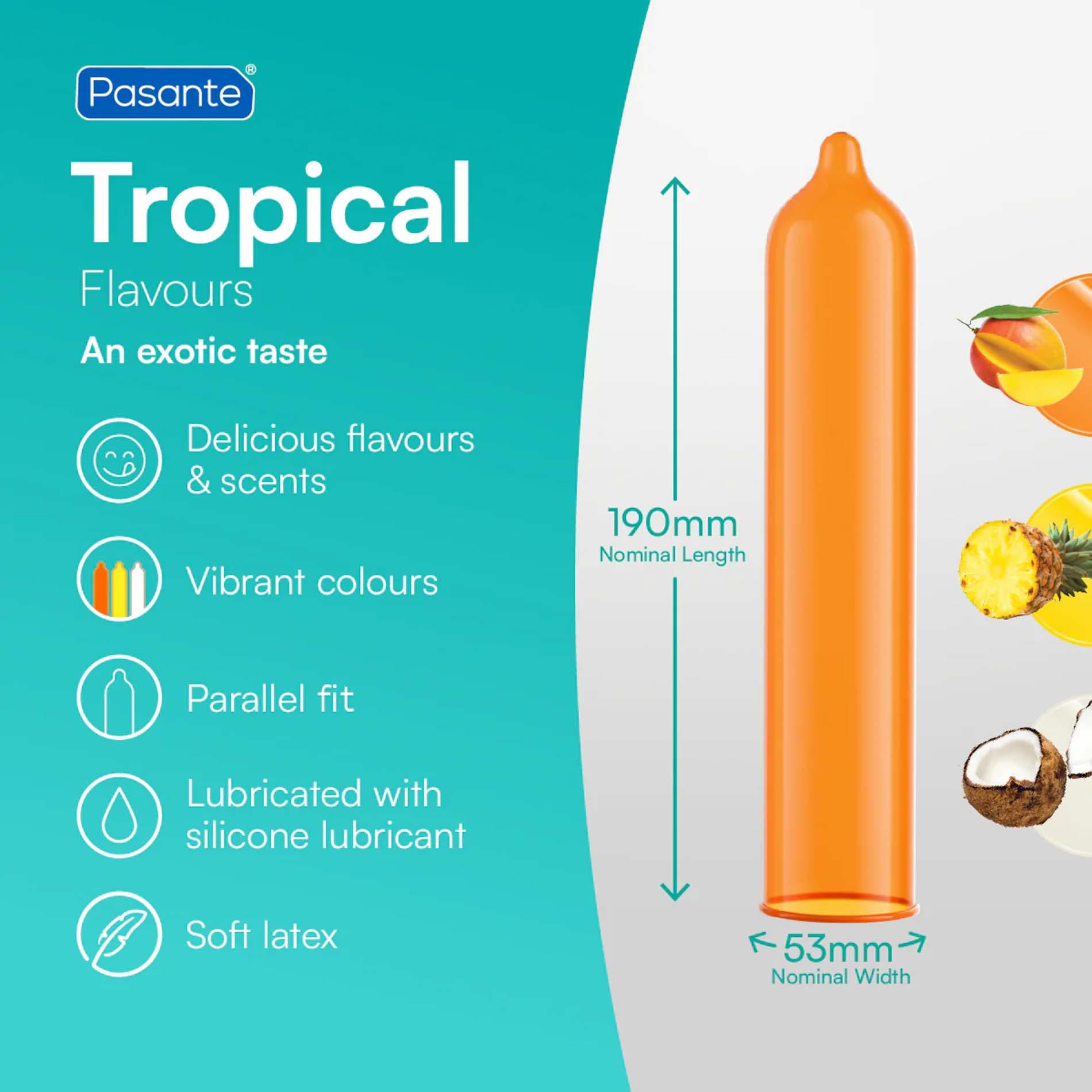 Pridėkite tropikų natą savo jausmingoms akimirkoms su Pasante Tropical – rinkiniu, pasižyminčiu trimis egzotiškais skoniais: Mango, Ananasų ir Kokosų. Lygūs, paprasti ir užtikrinantys saugumą.